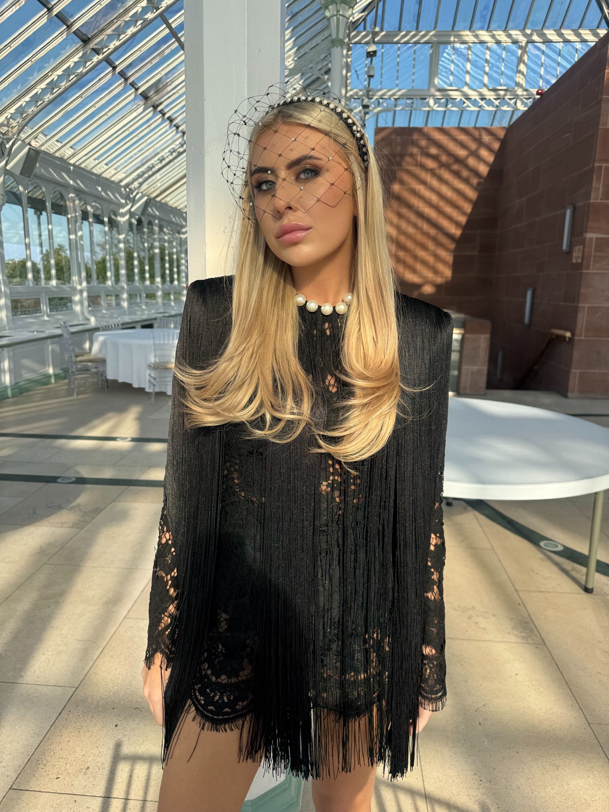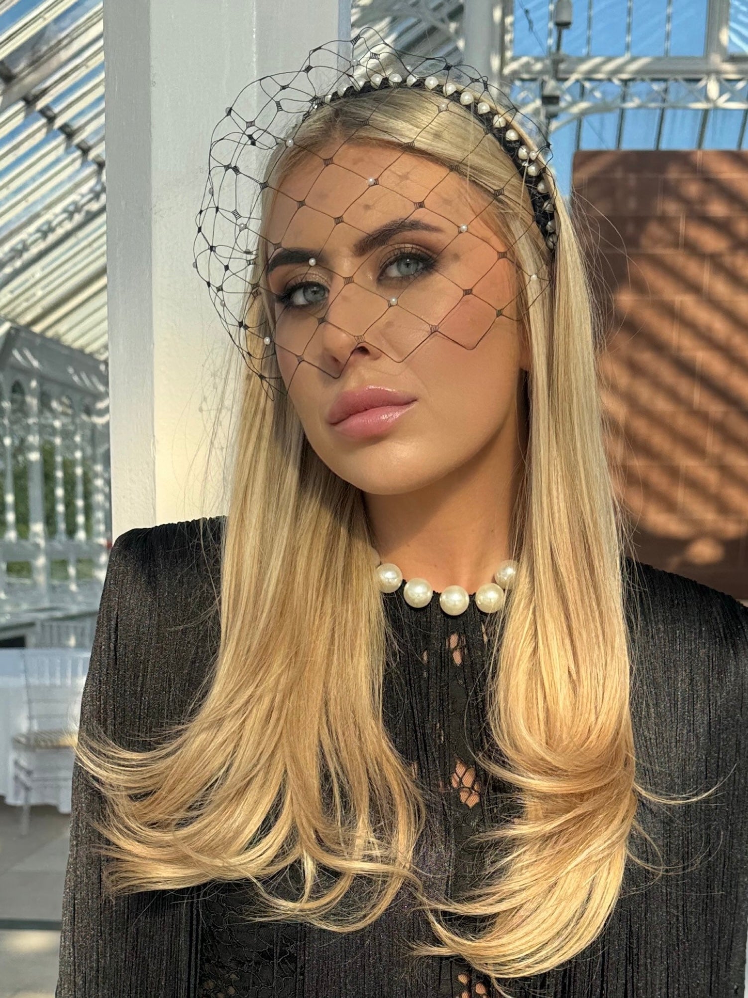 Veiled headband with strategically placed hand-tied pearls. Fine veiling frames the face with delicately placed miniature pearls throughout