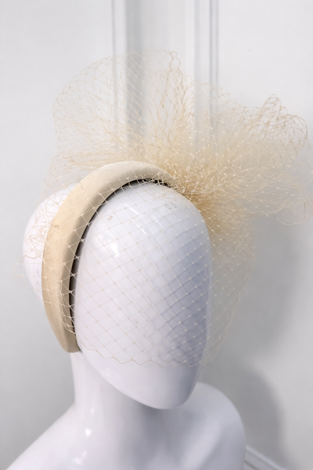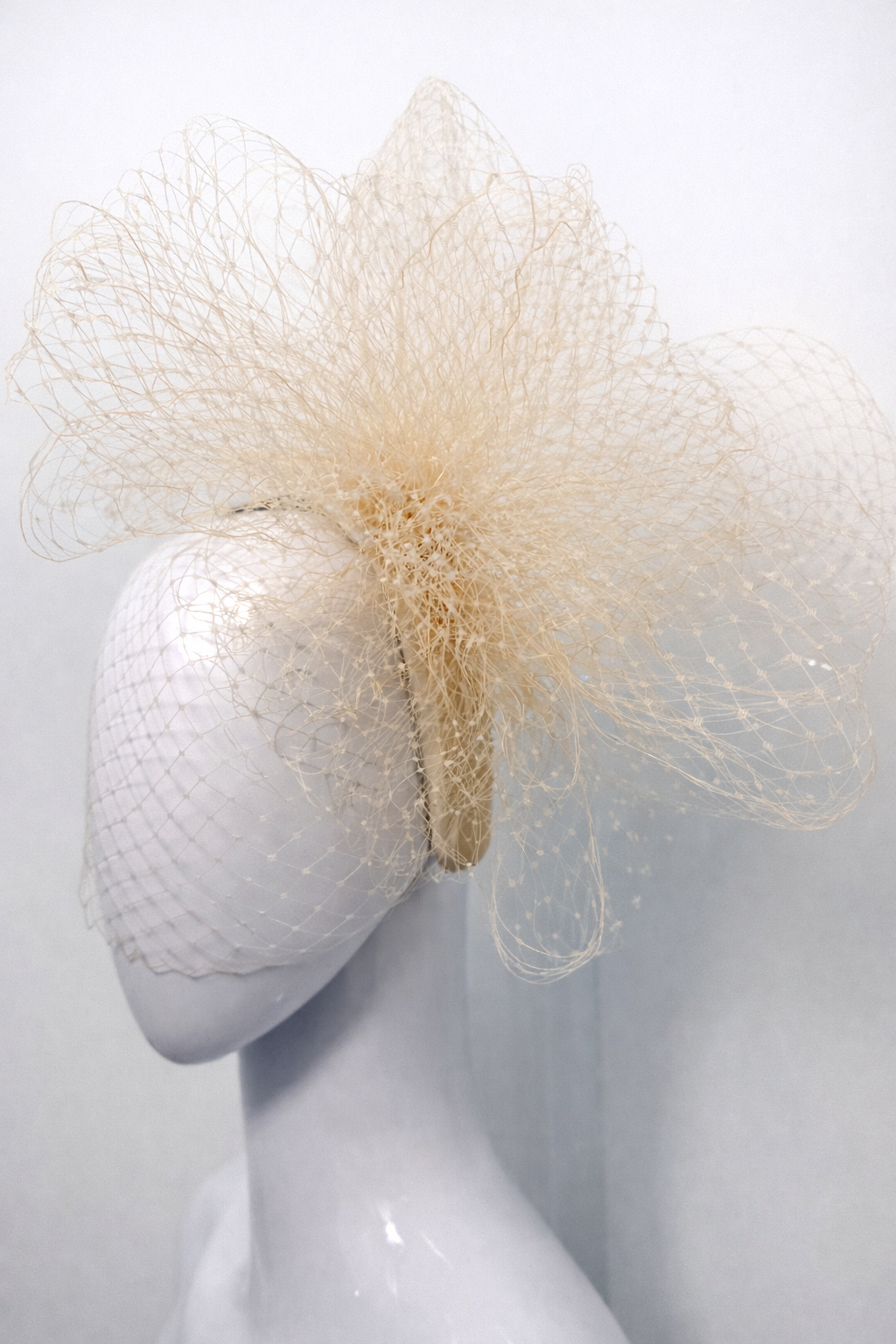 Metres of fine veiling are layered and shaped to create volume and movement from a minimal headband base. The neutral palette allows it to be styled repeatedly across different looks and seasons.